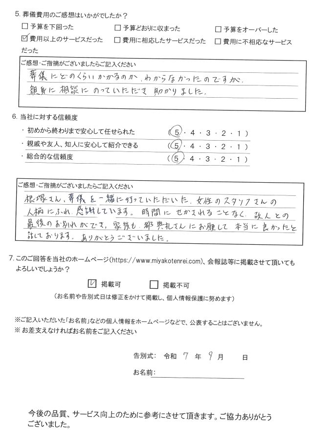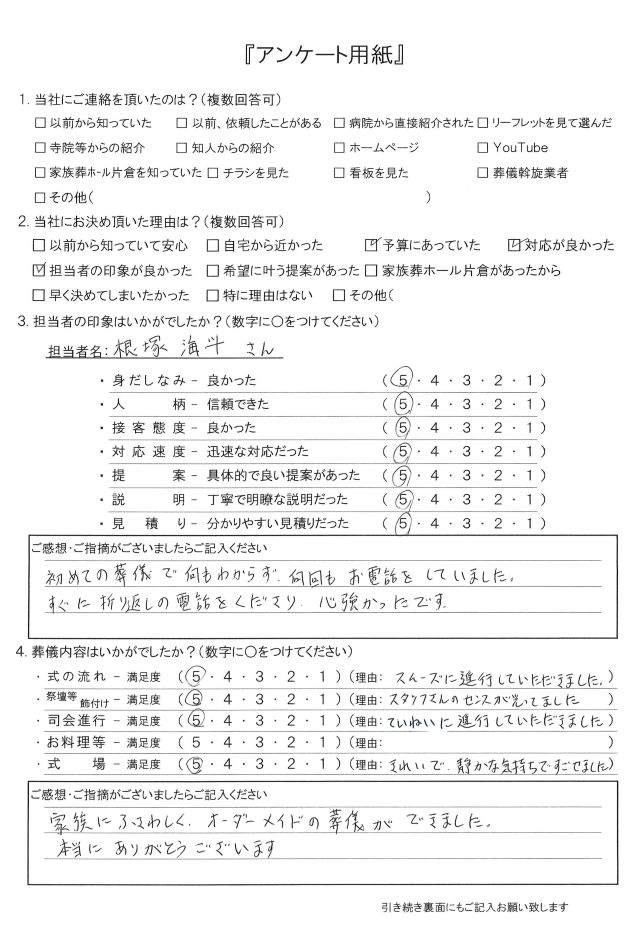 この度はアンケートへのご協力をいただき誠にありがとうございます。数ある葬儀社の中から当社をお選びいただきありがとうございました。初めてのご葬儀という事で沢山ご質問をいただき納得のいくご葬儀になり私自身も安心しております。今後ともお困り事などございましたらお気軽にご相談ください。大変にお疲れ様でございました。
