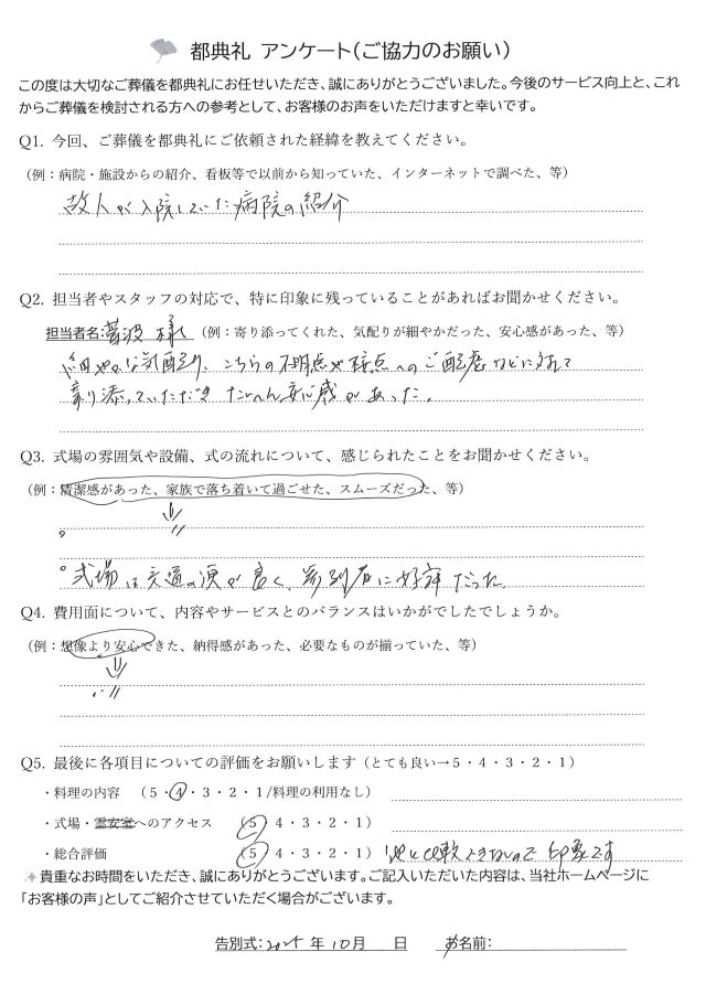 都典礼では葬儀の満足度向上ため、お客様にアンケートへのご協力をいただいております。以下が実際に書いていただいたアンケートです。