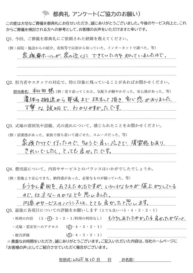 2025年10月、都典礼八王子店が施行させていただいた葬儀内容の詳細は、以下のようになっております。