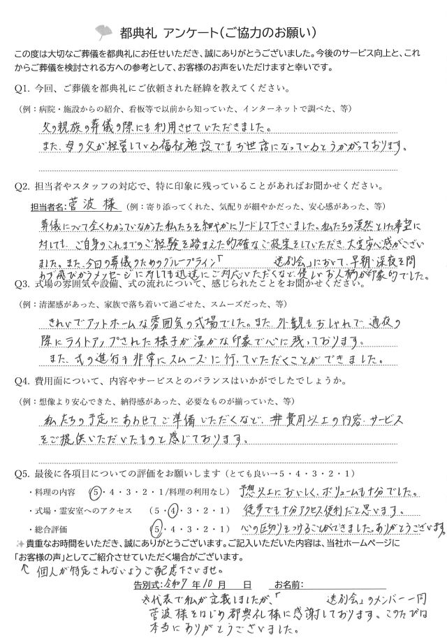 都典礼では葬儀の満足度向上ため、お客様にアンケートへのご協力をいただいております。以下が実際に書いていただいたアンケートです。