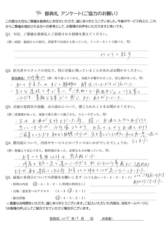 都典礼では葬儀の満足度向上ため、お客様にアンケートへのご協力をいただいております。以下が実際に書いていただいたアンケートです。