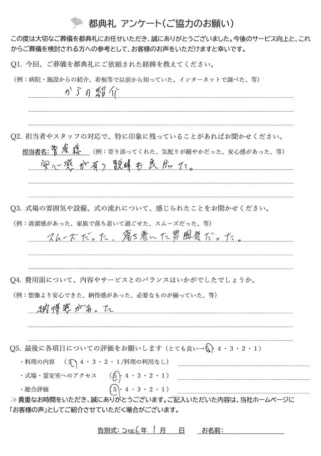 「安心感があり、説明も良かった」とのお言葉をいただき、大変光栄に存じます。ご不安なことが多い中、少しでもお客様の心に寄り添い、納得感を持って進めていただけたのであれば、私どもにとってもこれ以上の喜びはございません。ご葬儀が終わられた後も、お困りごとやご不明な点などがございましたら、いつでもお気軽にご相談ください。